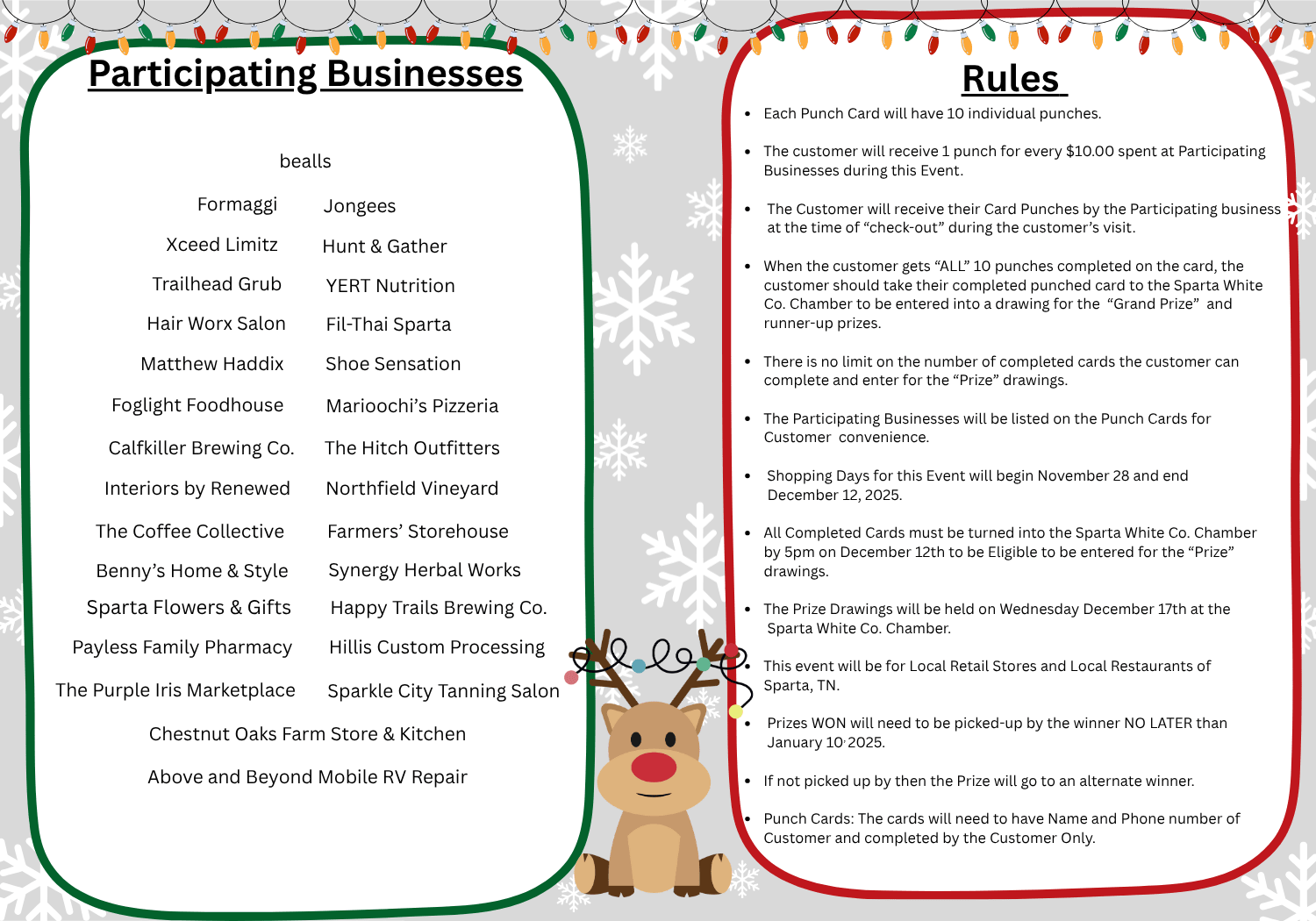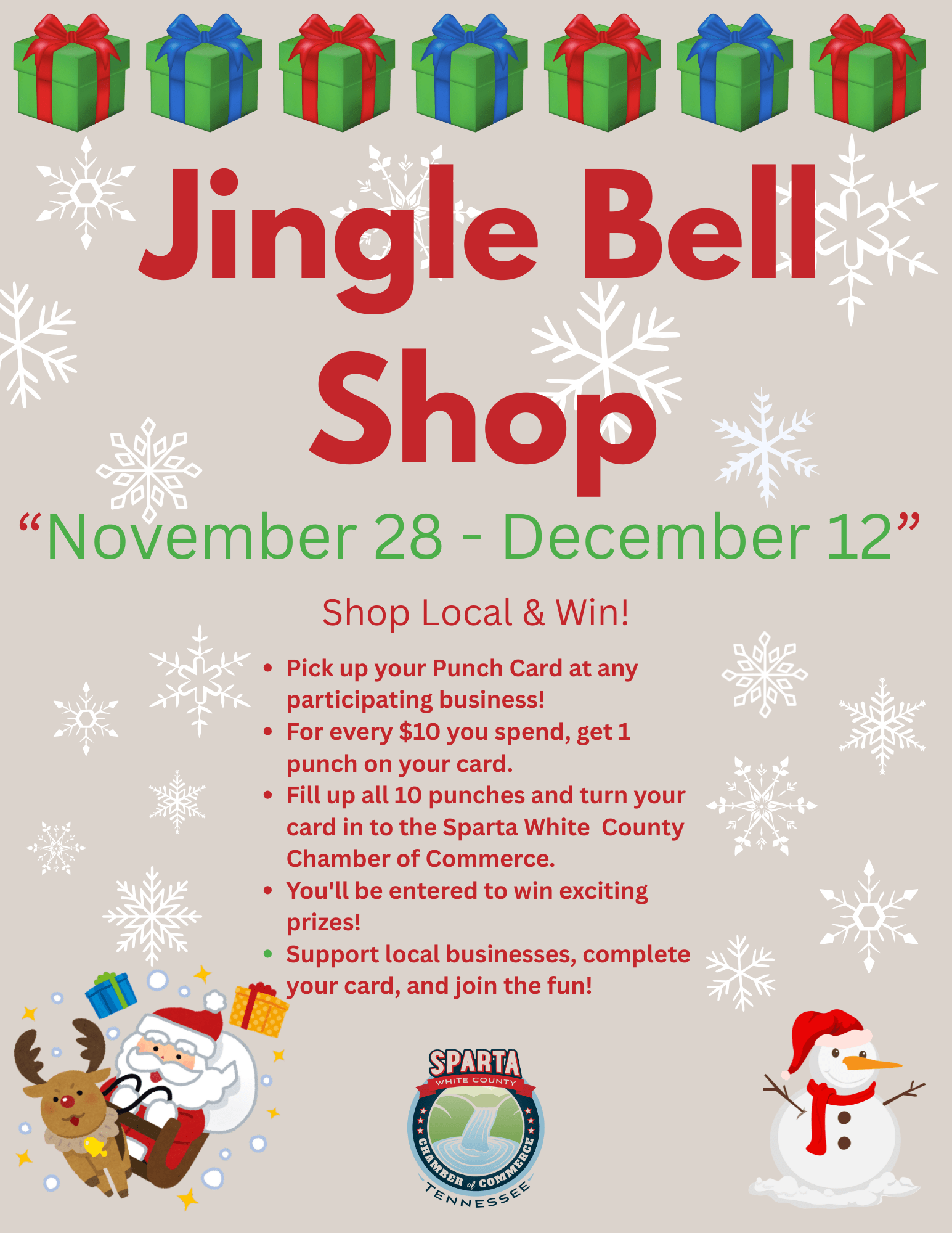 Shoppers -- Customers collect 10 punches on their card and can be entered into a drawing for prizes. The free punch cards will be available November 28 at participating businesses and at your Sparta White County Chamber of Commerce. For every $10 spent at participating businesses, you get a punch on your card. When all 10 punches are completed, please turn card into your Chamber to be entered for fabulous prizes donated by participating businesses. This event will be November 28 through December 12. All cards must be turned into your chamber by 5pm on December 12, 2025 to be eligible to win.
