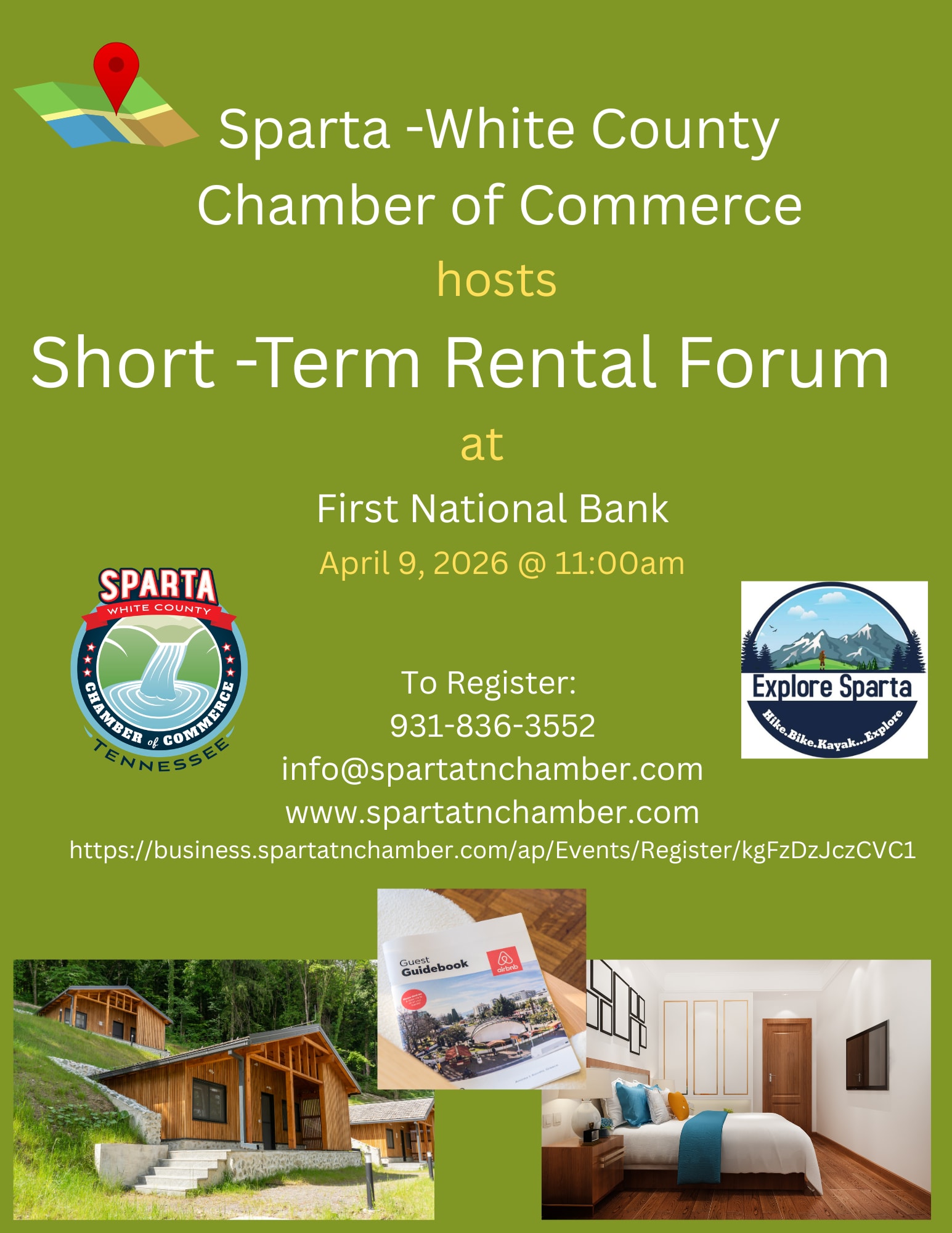 We invite you to join us for a Short-term Rental Forum. This event is a great chance for everyone interested in short-term rentals to come together. Whether you are a property owner, a renter, or just curious about this topic, your voice matters. Please bring your questions, concerns, and interests to share with the group. We want to hear what you think about short-term rentals and any challenges you may face. It’s a safe space where we can discuss ideas and learn from each other. Together, we can explore solutions and find ways to improve our community's experience with short-term rentals. This forum is not just about sharing problems; it’s also about discovering opportunities and building connections with others. So mark your calendar and join us for this community event. We look forward to seeing you there and talking about what’s important to you! Join us April 9th from 11am-1pm at First National Bank of Sparta.Images