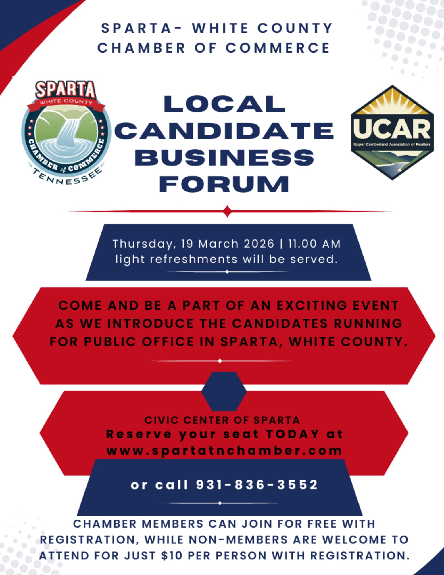Join us for the Candidate Forum on March 19, 2026, at 11:00am at the Sparta Civic Center. This informative event provides an opportunity to hear directly from local candidates. Chamber members attend FREE, and non-members may attend for a small fee of $10 per person. Light refreshments will be served. Registration is required prior to the event to attend. Chamber Members may submit questions for consideration by emailing them in advance to guestservices117@yahoo.com. We look forward to an engaging and informative discussion!